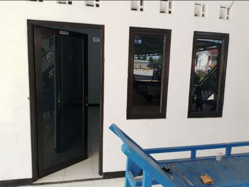 Penggantian kaca rusak dan perbaikan pintu aluminium.